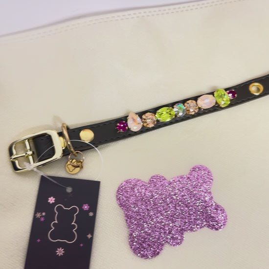 Collier pour chien en cuir vegan kaki, orné de cristaux Swarovski délicatement sertis et brodés à la main.