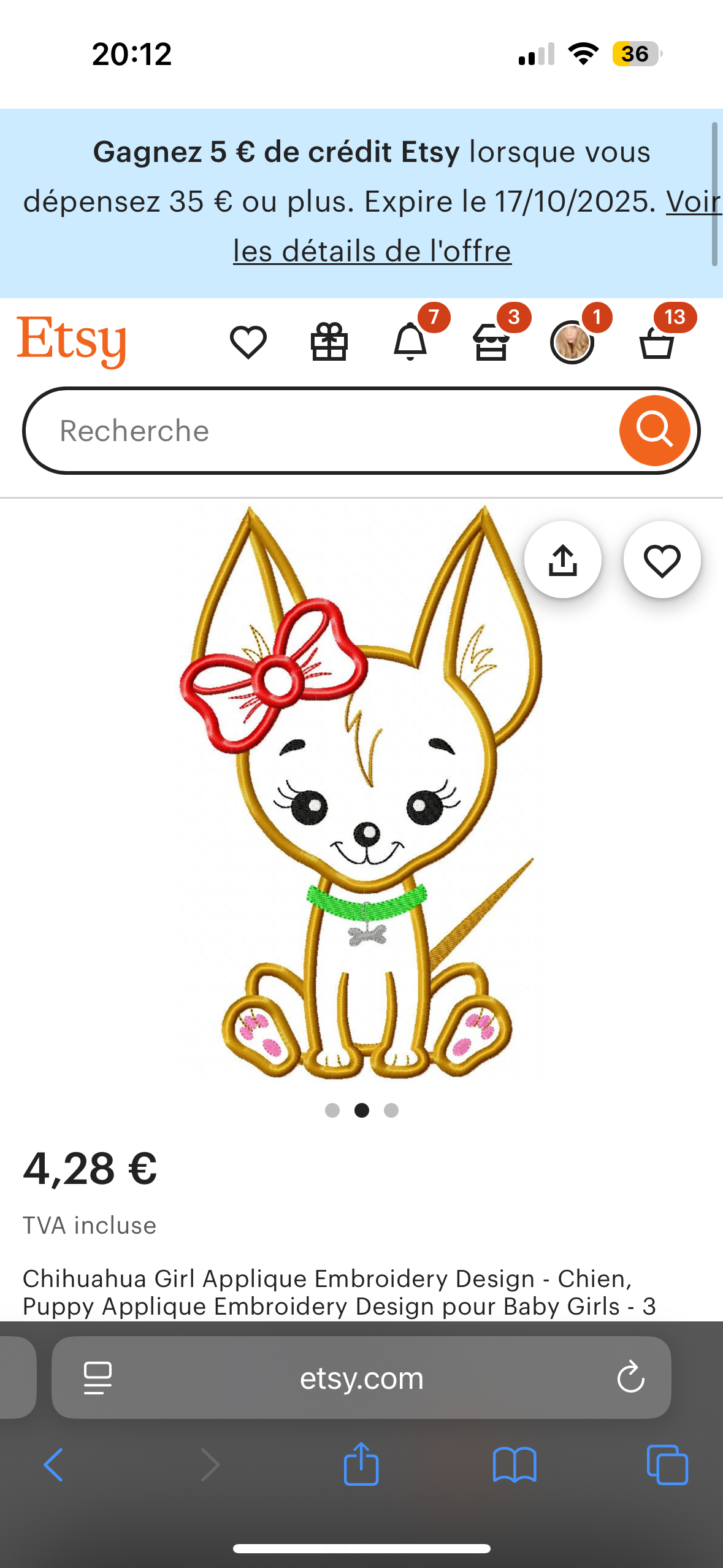 broderie chihuahua dans un cœur en velours serpent crème. Oreilles roses paillettes , corps taupe foncé paillettes + noeud rouge cerise paillettes (offert)